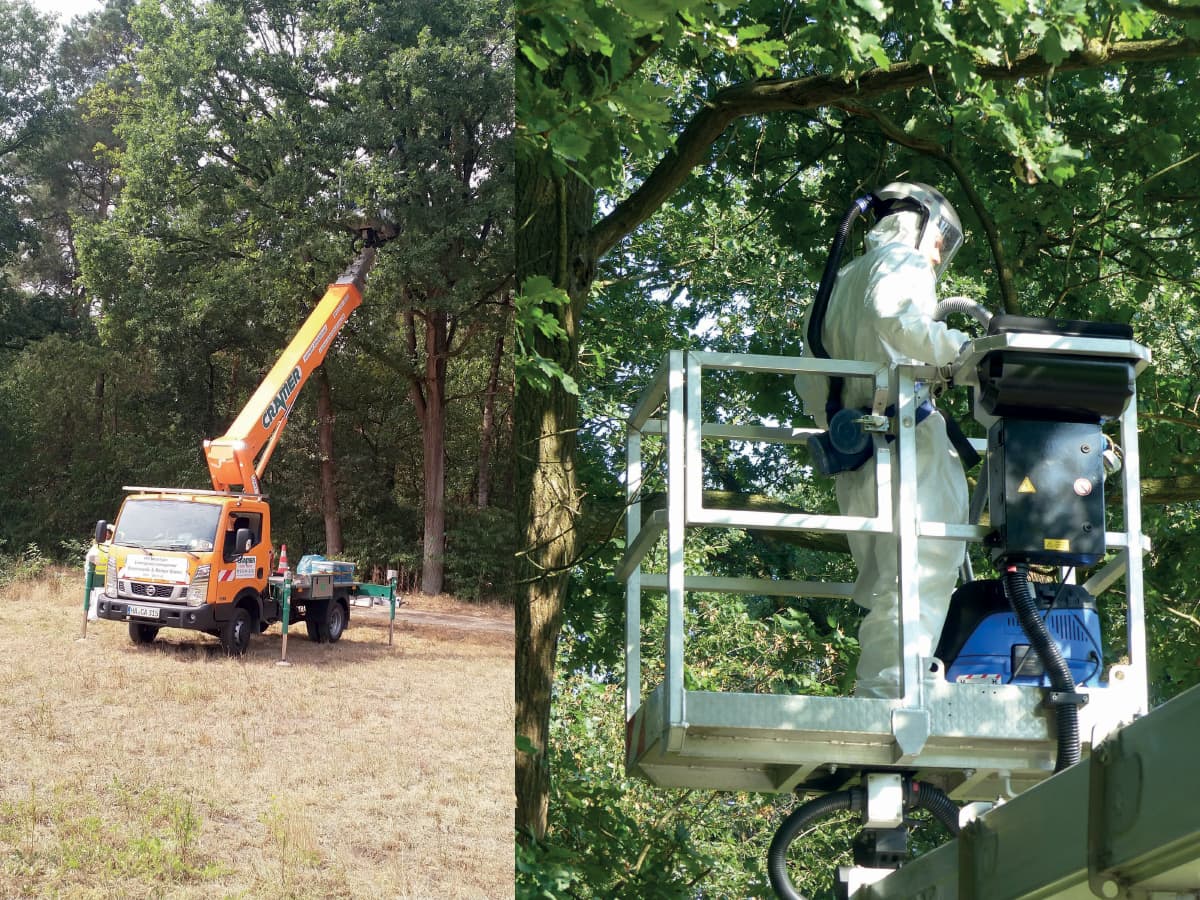 Seit 2018 führen wir im Großraum Osnabrück und den umliegenden Landkreisen Absaugung von Eichenprozessionsspinnern durch. Hierbei setzen wir bis zu 6 Teams ein, die mit der notwendigen Ausrüstung sicher und zuverlässig Bäume von den Raupen befreien. Zu unseren Kunden zählen wir hierbei Privatkunden, einzelne Gemeinden, ganze Landkreise und Firmen. Aufgrund unserer Größe können wir bei vorhandenen Befallsstellen zeitnah reagieren und die Nester der Eichenprozessionsspinner professionell entfernen.